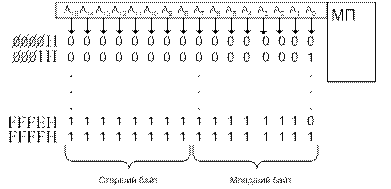 Изучаемый тип МП будет иметь 16 линий адреса, которые могут обеспечить 65536 различных комбинаций 0 и 1, т.к. запись не экономична, то двоичный адрес принято представлять в 16-тиричной системе.