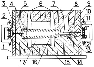 1- нижняя литейная опока; 2 – верхняя литейная опока; 3 – разъём; 4 – формовочные уклоны; 5 – вентиляционные каналы; 6 – выпор; 7 – литниковая чаша; 8 - вертикальный канал (стояк); 9 – шлакоуловитель; 10 – питатель; 11 – штыри; 12 – ручки опок; 13 – зона крепления питателей; 14 – модельная плита; 15 – формовочная смесь; 16 – литейный стержень; 17 – полость формы