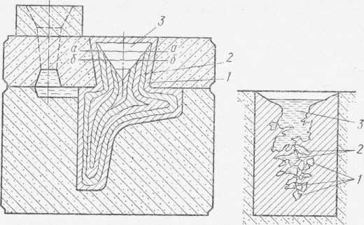Усадочная раковина – дефект в виде скрытой или открытой полости. Усадочные раковины сравнительно крупные полости, расположенные в местах отливки, затвердевающих последними (рис.7, а). Сначала около стенок литейной формы образуется корка 1 твёрдого металла. Уровень металла в незатвердевшей части отливки понижается до уровня а – а. На корке 1 нарастает новый твёрдый слой 2, а уровень жидкости опять понижается до уровня б – б. Снижение уровня расплава при затвердевании приводит к образованию сосредоточенной усадочной раковины 3.