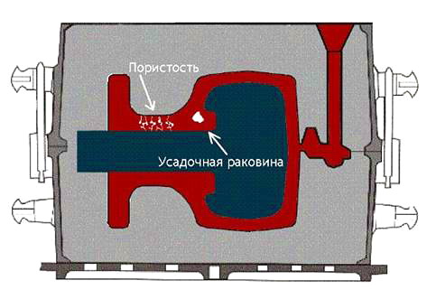 Усадка в отливках проявляется в виде усадочных раковин, пористости, трещин и короблений.