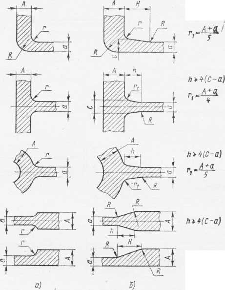 Рис. 11.40. Рекомендуемые переходы от стенки к стенке в литых деталях: