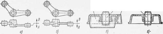 Кроме того, необходимо стремиться к уменьшению габаритных размеров и особенно высоты литой детали. Это облегчает изготовление модельного комплекта, а также процесса формовки, сборки форм и очистки отливок. При этом отливка имеет один плоский разъём и располагается по возможности в одной полуформе. Например, при изготовлении отливки, показанной на рис. 11.40, а, требуется сложный разъём. Разъём формы упростится, если конструкцию литой детали изменить, как показано на рис.11.40, б.