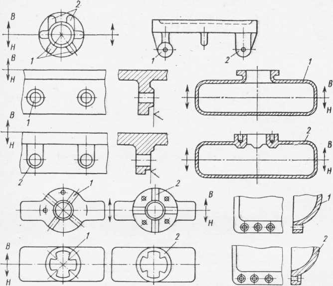 Рис.11. 38. Конструкции литых деталей, обеспечивающих одновременное (а) и направленное затвердевание (б) отливок: 1 - прибыль
