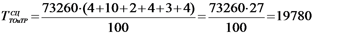 По таблице 1 (см. приложение 8) выбираем столбец «от 16 до 25» постов. Далее в соответствии с выбранным спектром услуг, предоставляемых проектируемым СЦ, определяем долю соответствующих видов регламентных работ: контрольно-диагностические – 4%, ТО в полном объеме – 10%, смазочные – 2%, регулировочные по установке углов передних колес – 4%, регулировочные по тормозам – 3%, электротехнические – 4%. Тогда годовой объем по ТО и ТР в СЦ, определяемый по формуле 6.1, составит