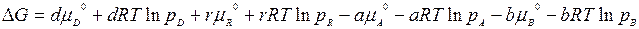 протекающую в газовой фазе и находящуюся в данный момент времени в неравновесном состоянии. Участники реакции характеризуются неравновесными парциальными давлениями: рА, рB, pD, pR и химическими потенциалами: μA, μB, μD, μR.