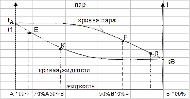 По оси ординат отложены температуры кипения, а на оси абсцисс состав смеси или пара, давление остается постоянным. Кипящая жидкость имеет иной состав, чем пар, поэтому на диаграмме изображены две кривые. Верхняя представляет состав пара, а нижняя состав жидкости. Возьмем состав жидкости отвечающий т.С 70% и т.В 30%, эта жидкость закипает при температуре t, а состав пара над ней будет отражать т.Д 90%В и 10%А. При температуре t1 больше температуры (t1>t) составу смеси отвечает т.Е, отвечает состав пара соответствует т.F, содержание вещества В в парах второй смеси меньше, чем в парах первой.