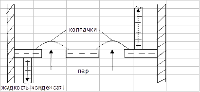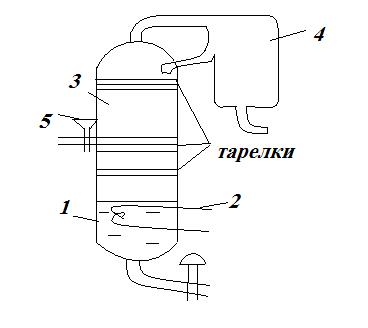 Колонна имеет несколько горизонтальных полок, они называются тарелками. Поступающая на дистилляцию смесь предварительно подогретая, подается через кран 5 на одну из средних тарелок и стекает через трубку на ниже расположенную тарелку. На этой тарелке жидкая смесь соприкасается с паром, который прорывается сквозь нее, подымаясь по колонне. Трубки снабжены колпачками, обеспечивающие хороший контакт пара с жидкостью. При этом часть менее летучего компонента конденсируется из пара в жидкость, а более летучий компонент переходит из жидкости в пар. Поднимаясь на выше расположенную тарелку, еще более обогащается низко кипящим компонентом. Этот процесс повторяется на каждой тарелке. В результате из верхней части колонны выходят пары более летучего компонента в практически чистом состоянии, а жидкость, практически состоящая, только из менее летучего компонента стекает в котел. В конденсаторе (холодильнике) 4 пары летучего компонента конденсируется. Часть конденсата, называемая флегмой, подается через сифон снова на верхнюю тарелку, а остальная часть поступает в сборник. Рефракционные колонны используются для разделения нефти, на продукты имеющие большую ценность, чем сама нефть (керосин, бензин). Перегонкой разделяют продукты брожения, получая этиловый спирт из пшеницы, а также метиловый спирт и ацетон при сухой перегонке дерева.
