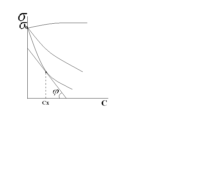 В растворах уменьшение поверхностной энергии может происходить не только за счет уменьшения площади, но и за счет уменьшения поверхностного натяжения. Уменьшение поверхностного натяжения на поверхности растворов может происходить за счет адсорбции. Адсорбция – самопроизвольный процесс концентрации растворенного вещества на границе раздела фаз. Вещества, адсорбция которых уменьшает поверхностное натяжение, называются поверхностно-активными (ПАВ). Вещества, которые не изменяют или увеличивают поверхностное натяжение, называются поверхностно-инактивными. Равновесие в системе определяется двумя процессами: притяжением молекул к поверхности под действием межмолекулярных сил и тепловым движением частиц, стремящимся восстановить равенство концентрации по всему объему раствора. Зависимость поверхностного натяжения растворов от концентрации веществ описывается кривой (на рис.2). Если кривая поверхностного натяжения идет вниз – это ПАВ, чем круче падает кривая, тем большей поверхностной активностью обладает ПАВ.