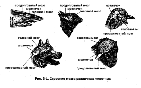 Усложнение психики и увеличение приспособительных возможностей прямо связано с развитием в ходе эволюции нервной системы. Существует прямая зависимость между уровнем развития нервной системы живого существа и сложностью его взаимодействия с внешним миром (Гаврилов В., 1997). В опытах рыб и обезьян учили различать геометрические фигуры. Оказалось, что рыбы не хуже, чем обезьяны, могут учиться отличать квадрат от треугольника — они быстро плывут к той картинке, около которой им нужно дернуть за бусинку, чтобы получить награду (корм). Но если экспериментатор изменял цвет геометрической фигуры с черного на красный, то все обучение нужно было начинать сначала. Для рыбы черный и красный квадраты — это совершенно разные фигуры! Для собаки же все квадраты объединены в класс «квадрат», все треугольники — в класс «треугольник». Даже щенок, который едва научился ходить, так же хорошо различает фигуры, как и взрослая собака. Строение мозга у рыбы и собаки отличается весьма существенно — мозг собаки имеет борозды, извилины и кору, мозг рыбы остановился на уровне промежуточных структур (рис. 3-1).