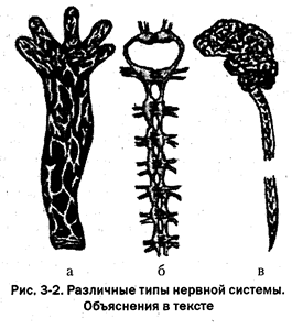 Нервная система прошла в своем развитии путь от сети, волокна которой соединяют чувствительные клетки с сократительной тканью, до сверхсложной структуры мозга современного человеке (Вилли К., 1966). Наиболее древней является сетевидная нервная система (рис 3-2, а). Этот тип нервной системы имеют кишечнополостные животные, например гидра. Возбуждение «разбегается» по нервной системе гидры во всех направлениях. Поэтому реакции ее неточные, как бы приблизительные. Если уколоть ее щупальце иглой, она вся сожмется, тогда как более развитое животное могло бы просто отдернуть щупальце. Сетевидная нервная система обеспечивала ответ живого существа без всяких альтернатив, а более сложный вариант предусматривал «выбор» ответа, потому что связь чувствительных клеток с сократительной тканью происходила через специализированные двигательные клетки. Такова, например, нервная система медузы, у которой в зависимости от локализации раздражения и его силы, по-видимому, возможна и градация ответной реакции.