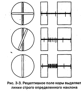 Фактически во всем диапазоне углов наклона линии от 0 ° до 180 ° были обнаружены специфические нейроны, имевшие для идентификации этих линий рецептивные поля с определенной организацией возбудительных и тормозных областей. Например, существуют поля, которые «видят» только горизонтальную линию, движущуюся вверх-вниз, а на вертикальную, гуляющую вправо-влево, не реагируют. Зрительных кортикальных нейронов с рецептивными полями разной сложности насчитываются тысячи, сотни тысяч и миллионы. Их рецептивные поля перекрывают друг друга и позволяют зрительному аппарату с помощью одних и тех же рецепторов оценивать и элементы контура, и яркость, и цвет, причем могут делать это сразу по всему полю зрения. В области наиболее четкой видимости — в центральной ямке сетчатки — сосредоточены поля формы. Ближе к краям — поля яркости и движения, так что даже боковым зрением удается заметить мчащийся автомобиль или вспыхнувший фонарь. Эти рецептивные поля обнаружены у всех млекопитающих, на которых были проведены эксперименты, — у кошек, обезьян, кроликов, сусликов, бурундуков.