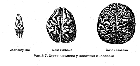 Строение мозга у животных разных видов неодинаково. У предков млекопитающих, как и у современных рептилий, кора больших полушарий была очень слабо дифференцирована (рис. 3-7). Но на пути от рептилиеподобных предков до современных млекопитающих произошло значительное увеличение коры мозга по сравнению с другими структурами, которые, конечно, тоже подверглись изменениям по размерам, форме, объему (Гаврилов В., 1997). При этом степень увеличения коры мозга отличает приматов от других млекопитающих, а человека — от остальных приматов. Соотношение площади коры мозга у мыши, макаки и человека 1:100:1000, а соотношение объемов коры головного и спинного мозга у крыс и человека — 31:35 и 77:2 cooтветственно.
