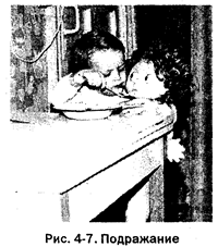 Первым из таких механизмов в ходе развития и является подражание — воспроизведение ребенком движений, действий, поведенческих актов других людей. Вплоть до конца дошкольного возраста, подражая старшим, ребенок усваивает действия с предметами, навыки самообслуживания, нормы поведения, овладевает речью. Именно подражание лежит в основе научения— процесса формирования поведенческих актов, приспособленных к конкретным условиям среды. Отметим что и подражание, и научение являются общебиологическими механизмами приобретения индивидуального опыта (рис. 4-7).