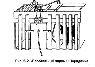 На рубеже XIX и XX вв. американский исследователь Э. Торндайк пытался выяснить, существует ли у животных разум, или интеллект. Для этого он построил «проблемный ящик» (рис. 6-2), в который помещал голодных котов. Вне клетки находилась пища, как правило, рыба. Животное могло открыть дверку ящика только в том случае, если оно нажало на педаль внутри ящика или потянуло за рычаг. Но коты вначале пытались достать приманку, просовывая лапы сквозь решетку клетки. После серии неудач они обычно обследовали все внутри, производили разнообразные действия. В конце концов животное наступало на рычаг, и дверка открывалась. В результате многочисленных повторных процедур животные постепенно переставали совершать лишние действия и сразу нажимали на педаль.