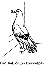 Разберем типичный эксперимент Скиннера. Голодного голубя сажают в так называемый «ящик Скиннера» (рис. 6-4). Внутри ящика нет ничего, кроме кнопки и находящейся под ней кормушки. Голодная птица, попав в клетку, начинает все обследовать, рассматривать и в результате ударяет клювом по кнопке. Опять повторяется поиск: голубь клюет пол или кормушку, в итоге опять клюет кнопку. Так животное в течение некоторого времени несколько раз клюет кнопку. Количество клеваний по кнопке, скажем, за полчаса, условно принимают за исходный оперантный уровень. Далее включают кормушку, и теперь голубь после каждого удара по кнопке получает зернышко. Через некоторое время птица научается клевать кнопку, так как это действие подкрепляется. Чем больше она клюет кнопку, тем больше она получает пищи. Если голубь будет клевать кнопку с высокой частотой, то это действие характеризуется высоким оперант ным уровнем, если будет клевать ее редко, то действие будет иметь низкий оперантный уровень.