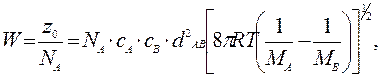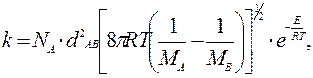 Рассмотрим для примера бимолекулярную реакцию, в которой превращение осуществляется в результате соударения двух молекул А и В. Упрощенный расчет числа соударений между молекулами А и В в единицу времени в единице объема, основанный на молекулярно-кинетической теории газов, дает