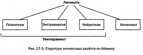 К числу широко распространенных концепций этого направления относятся представленная на рис. 17-3 модель Г. Айзенка (1985, с. 159) и модель М. Цукермана (Zuckerman М., 1990). Последняя включает в себя следующие характеристики: социабельность, эмоциональность, активность, «импульсивный несоциализированный поиск ощущений», «агрессивный поиск ощущений». Выраженность свойств, входящих в эти модели личности, оценивается с помощью разработанных авторами опросников.