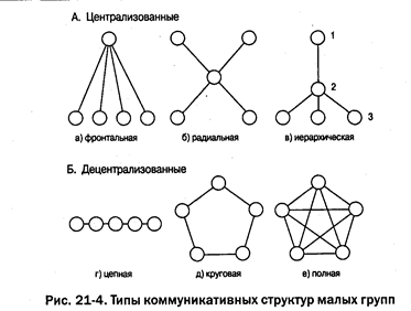 В группах с централизованными коммуникативными структурами коммуникации осуществляются через одного индивида, занимающего центральную позицию. Это способствует повышению управляемости группы и более быстрому решению простых задач. В группах с децентрализованными коммуникативными структурами возможности индивидов участвовать в коммуникациях распределены более равномерно. Такие группы успешнее решают сложные и творческие задачи, в них выше удовлетворенность индивидов членством в группе (рис. 21-4).