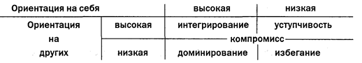«Ориентация на себя» означает степень стремления индивида удовлетворить свои потребности и интересы. «Ориентация на других» означает степень стремления или предрасположенности индивида удовлетворять потребности и ожидания других. Комбинации этих параметров дают пять стилей, или способов, управления конфликтами: