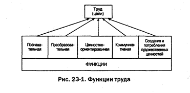 Труд, профессия, специальность. Труд — это целесообразная деятельность по преобразованию окружающего мира для удовлетворения потребностей человека. Труд является одним из основных видов осознанной активности человека, которая служит средством и способом его самореализации в личной и общественной жизни, общения, познания себя и окружающего мира, развития себя как личности, самоутверждения, создания материальных и духовных ценностей и личного достатка. Достижение указанных целей труда обеспечивается следующими его функциями (рис. 23-1):