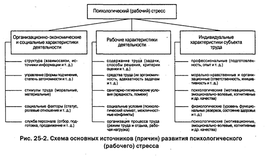 Психологический стресс — это состояние чрезмерной психической напряженности и дезорганизации поведения, которое развивается в результате угрозы или реального воздействия экстремальных факторов социального, психологического, экологического и профессионального характера (рис. 25-2). Анализ психологического стресса требует учета как значимости ситуации для субъекта, так и его личностных характеристик. Стресс в значительной степени является продуктом образа мысли и оценки ситуации, знания собственных возможностей, степени обученности способам управления и стратегии поведения в экстремальных условиях. Психологический стресс представляет собой прежде всего состояние тревоги за жизнь, здоровье, успех, благополучие.