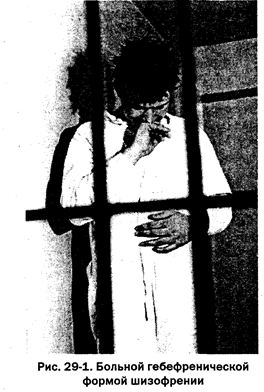 В отечественной психиатрии шизофренией (от греч. σχιζο — расщепляю, φρεν — душа) обозначают группу сходных психических расстройств неясной этиологии, у которых, вероятно, имеются общие эндогенные патогенетические механизмы развития в виде наследственной аномалии, не проявляющейся до определенного периода жизни. Без лечения характерно прогрессирующее или приступообразное течение, обычно завершающееся однотипной картиной изменения личности (дефекта) с дезорганизацией психических функций (мышления, эмоций, психомоторик — всего поведения в целом) при сохранности памяти и приобретенных ранее знаний (рис. 28-1).