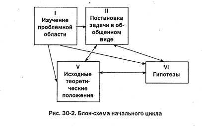 Начальный цикл описывает задачу, решаемую исследователем на первых этапах работы, и охватывает исходную, предварительную стадию исследовательского поиска, стимулируемую существующим у ученого интересом к проблемной области. Еще до начала собственно психологической реконструкции предполагается углубленное знакомство с проблемной областью, выделяемой для научного исследования, осознание ее теоретической и практической значимости, места в системе психологического знания, уровня разработанности, выявление в ней пробелов и так называемых «белых пятен». Поэтому блок I начального цикла назван автором «изучение проблемной области» (рис. 30-2).