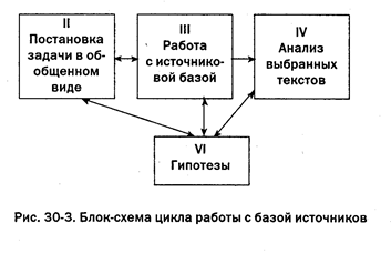 С другой стороны, знакомство с реальными источниками вносит существенные коррективы в формулировку и конкретизацию исходной, довольно общей задачи. Что касается исследования А. Д. Барской, то ограниченность базы источников, во-первых, заставила отказаться от претензии на реконструкцию психики человека указанного периода во всей ее целостности и остановиться лишь на описании наиболее ее характерных черт, во-вторых, привела к уточнению рассматриваемого временного периода: VIII в. до н. э., а не V в. до н. э., как первоначально предполагалось. На рис. 30-3 представлена блок-схема цикла работы с базой источников.