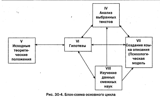 Центральным в этом цикле является блок IV, названный «анализ текста». Процедура анализа источников опирается на общие принципы источниковедческого анализа. В психологической литературе она не получила достаточного освещения. Спицына указывает, что это «не простое ознакомление с текстом, а совокупность аналитико-синтетических процедур» (Спицына Л. В., 1994. С. 15). К сожалению, и лингвистика пока не дает серьезных опорных точек для решения данной задачи. В большинстве наиболее влиятельных лингвистических направлений предметом изучения является формальная структура языка, и самой крупной его единицей выступает предложение (Сгалл П., 1978). Хотя очевидно, необходим анализ не только формы, но и содержания текста. Продуктивные попытки соединения количественного и качественного анализа текстов представлены в исследованиях, проводящихся сотрудниками лаборатории психологии речи Института психологии РАН под руководством Т. Н. Ушаковой, а также в структурной модели анализа текста, предложенной Т. М. Дридзе (1984). Так, Дридзе предлагает при реконструкции того или иного объекта проводить анализ текста с точки зрения его вторичной информативности. Источником вторичной информативности являются не основные, а второстепенные элементы текста: иллюстрации к основным идеям, описание ситуаций и отношений к ним, общий фон, «фоново-событийный», «фоново-субъективный», «фоново-образный» аспекты.