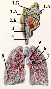 | 1. Вне- лёгочные воздухо- носные пути | I. Носовая полость: а) преддверие (1.А) и б) собственно носовая полость (1.Б) с 2-мя отделами - дыхательным (нижняя часть полости) и обонятельным (верхняя часть) (п. 16.3). | Рисунок - дыхательная система. А. Вид в целом |