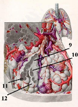 | 3. Респира- торные отделы (ацинусы) | X. Образования, в стенке которых содержатся альвеолы: респираторные бронхиолы (9) - 1-го, 2-го и 3-го порядков; альвеолярные ходы(10), альвеолярные мешочки (11). | Б. Ацинус. |