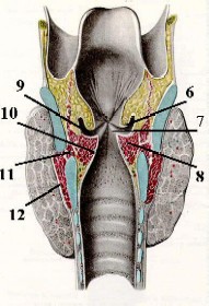 г) Между теми и другими находятся углубления - желудочки гортани (9). Они могут продолжаться вверх