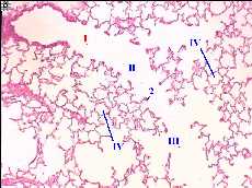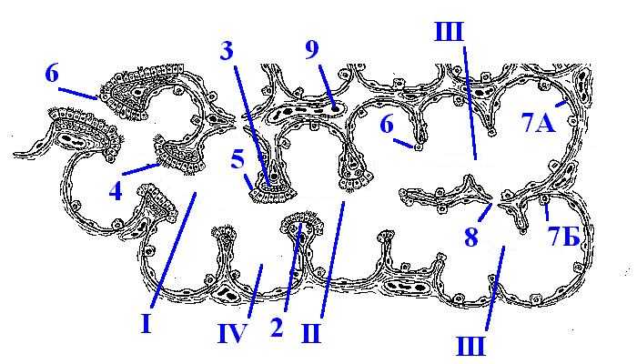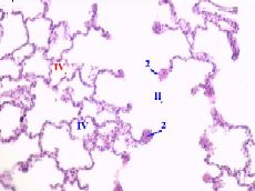 | 1. Общее описание | а) Альвеолярный мешочек (III) – это как бы "гроздь" альвеол. б) А. В очень узких стенках альвеолярных мешочков остаётся только один вид эпителиальных клеток – клетки Клара. | |