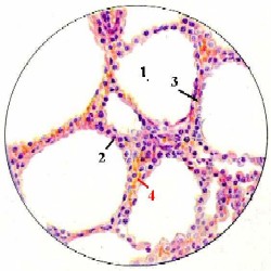 а) Здесь альвеолы показаны при большом увеличении. б) Видны просвет (1) альвеол, выстилающий их однослойный плоский эпителий (2), межальвеолярные перегородки (3) с кровеносными капиллярами (4). | Полный размер |