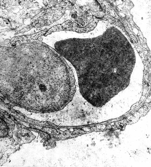 На этом снимке - несколько иной ракурс. а) Основную часть кадра занимает кровеносный капилляр, где 1 - ядросодержащая часть одного из эпителиоцитов, выбухающая в просвет (2) капилляра; 3 - эритроцит. б) Просвет альвеолы - 8; сурфактант на снимке отсутствует. в) Остальные компоненты барьера - налицо: тонкие цитоплазматические части (5) альвеолоцитов I типа, соединённых между собой десмосомами (9), слившиеся базальные мембраны (6) эпителия и эндотелия, тонкие цитоплазматические части (4) эндотелиоцитов, тоже соединённых между собой десмосомами (9) (вверху снимка) | |