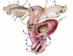 | Общий план строения | а) Матка (3) - полый мышечный орган. б) На фронтальном разрезе имеет вид треугольника: его основание обращено кверху (к дну), | |