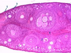 1. а) А. Яичник с поверхности покрыт не всем слоем брюшины, а только мезотелием (1) (что облегчает овуляцию). Б. На апикальной поверхности клеток мезотелия имеются микроворсинки. б) Под эпителием находится белочная оболочка (2), образованная плотной волокнистой соединительной тканью. 2. Собственно яичник подразделяют на корковое вещество (3), прилегающее к поверхности, и мозговое вещество (4), располагающееся в глубине органа. | 1,а. Препарат - яичник. Окраска гематоксилин- эозином. Полный размер |