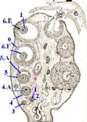 2. а) В данной группе различают первичные (4), вторичные (5) и третичные (6) фолликулы. б) Это последовательные стадии развития фолликулов, и по мере перехода от примордиального фолликула к третичному значительно увеличивается объём ооцита и всего фолликула, причём в фолликуле появляются новые структуры: | |