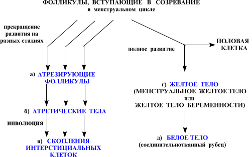III. Погибающие фолликулы. а) Кроме фолликула, дошедшего до овуляции, все остальные созревающие фолликулы останавливаются в своём развитии на той или иной стадии и | |