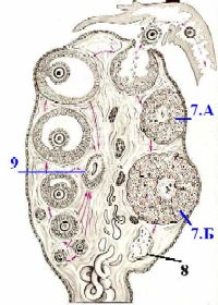 подвергаются атрезии – процессу, ведущему к гибели ооцита и фолликулярных клеток. б) Причём, как показано на схеме, на начальной стадии такие фолликулы называются атрезирующими; позже они превращаются в атретические тела (9) и скопления интерстициальных клеток. в) Постоянно вступает в атрезию и какое-то количество покоящихся (примордиальных) фолликулов. | Схема - яичник Полный размер |