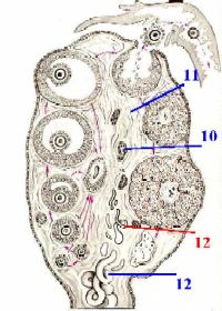 1. Мозговое вещество в яичнике – это узкая полоса соединительной ткани (11) в глубине органа, в которой содержатся а) сосуды (10), идущие далее в корковое вещество; б) нервные волокна (тоже продолжающиеся в кору) - чувствительные, а также эффекторные - симпатические и парасимпатические; в) эпителиальные тяжи и трубочки (12), образующие сеть яичника и представляющие собой остатки канальцев (12) первичной почки (из которой, как и яички, развиваются яичники). | Схема - яичник Полный размер |