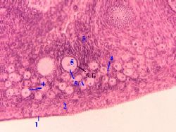 мезотелий (1), белочная оболочка (2), соединительнотканные прослойки (3); примордиальные фолликулы (4) и ооцит (5А) первичного фолликула. | |