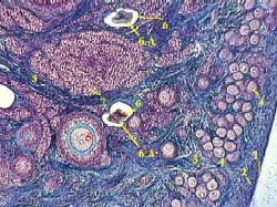 | Примор- диальные и первичный фолликулы | 1. При окраске яичника по Маллори некоторые структуры выявляются лучше. 2. В частности, хорошо видны уже рассмотренные нами фолликулы: многочисленные мелкие примордиальные фолликулы (4), сосредоточенные в субкапсулярной зоне, а также один первичный фолликул (5), отличающийся размером, наличием блестящей оболочки (5А) и кубической формой фолликулярных клеток. | 2,а. Препарат - яичник. Окраска по Маллори. Полный размер |