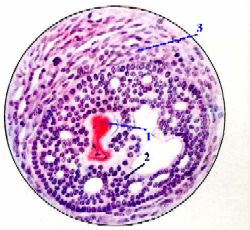 | II. Атрети- ческие тела | а) В атретическом теле фолликулярных клеток уже нет. б) В центре тела, как и в предыдущем случае, находится сморщенная блестящая оболочка (1). в) Но теперь вокруг неё расположены текальные, или интерстициальные, клетки (2) с характерными округлыми ядрами. | Атрезия вторичного фолликула. Рисунок с препарата Полный размер |