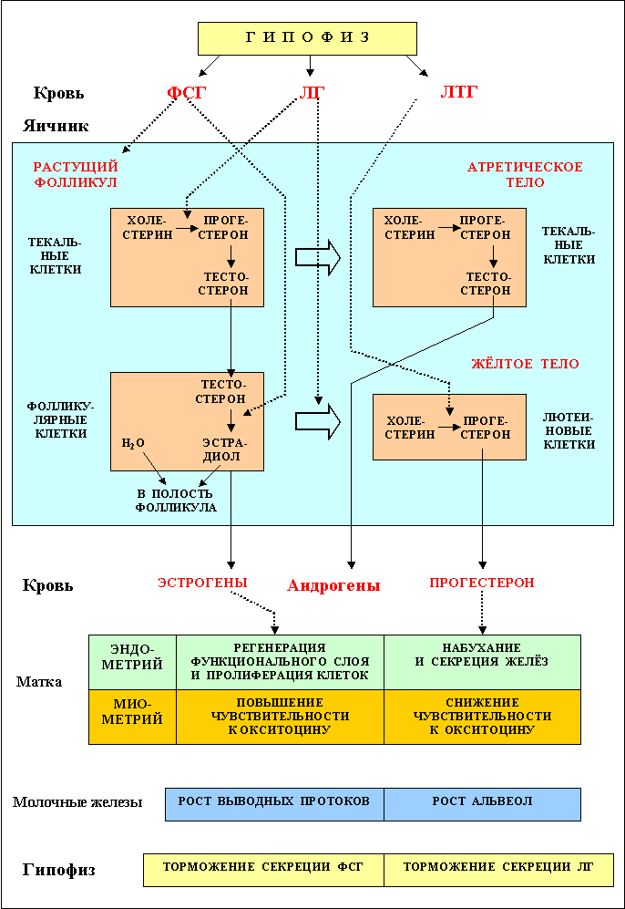 1. Выше мы уже упоминали об участии яичников в эндокринных взаимодействиях – в т.ч.: о влиянии на яичники гормонов гипофиза (ФСГ, ЛГ, ЛТГ), а также о синтезе в самих яичниках эстрогенов, андрогенов и прогестерона. 2. Приводимая ниже схема суммирует и несколько дополняет эти сведения. |
