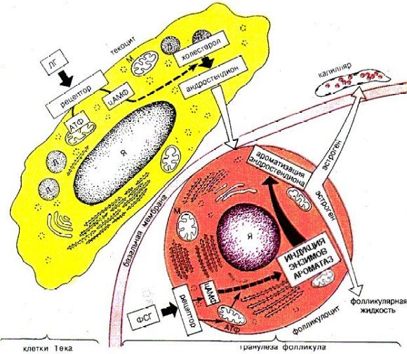 | Пути секреции эстрогенов | Эстрогены секретируются, во-первых, в фолликулярную жидкость, во-вторых, в кровь (для чего должны проходить обратно через базальную мембрану фолликула). |