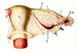 воронку (2.А), которая - имеет на краях многочисленные бахромки и - во время овуляции охватывает поверхность яичника (1);