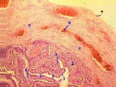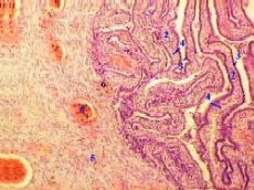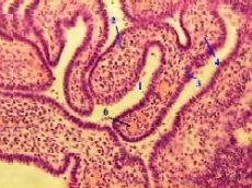 1. На снимках мы видим просвет яйцевода (1) и в нём - многочисленные складки слизистой оболочки (2). 2. а) Складки покрыты однослойным призматическим реснитчатым эпителием (3). б) В толще складок - рыхлая соединительная ткань, составляющая собственную пластинку (4) слизистой оболочки. 3. Основную часть толщины стенки составляет мышечная оболочка (5) из двух слоёв - циркулярного и продольного. 4. Между мышечными пучками идут прослойки соединительной ткани с многочисленными кровеносными сосудами (6). 5. Ещё кнаружи находится соединительная ткань серозной оболочки (7). |