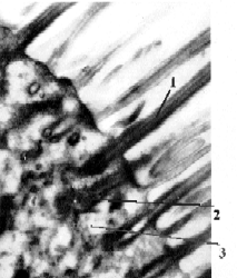 | Электронная микрофотография - апикальная часть реснитчатой клетки эпителия яйцевода. 1. На этой микрофотографии отчётливо видны реснички (1) на апикальной поверхности эпителиальной клетки яйцевода. 2. Как обычно, они начинаются от базальных телец (2), лежащих в поверхностном слое цитоплазмы (3). | Полный размер |