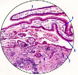 | Рисунок с препарата - бахромка маточной трубы и яичник. 1. Наконец, на этом рисунке показаны бахромки воронки яйцевода (1), прилегающие к поверхности яичника (2). 2. Бахромки, как и прочие отделы слизистой оболочки трубы, покрыты призматическим реснитчатым эпителием (3). 3. А в яичнике видны фолликулы (4) различной степени зрелости. | Полный размер |